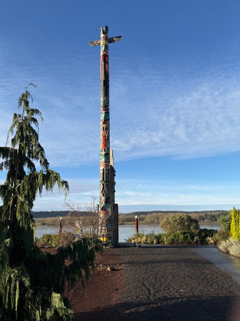 Immediately upon returning to solid ground, a pair of magnificent totem poles towered watchfully overhead, missing only the tallest one which lay mounted in perpetuity in the Mountain Timber Market. Just beyond that stood the Kalama McMenamins Harbor Lodge, the prominent hotel and bar in town. The warm, dark exterior housed a cozy gift shop, where visitors could find novelty stickers and coffee roasts, among an extensive array of other trinkets and souvenirs.